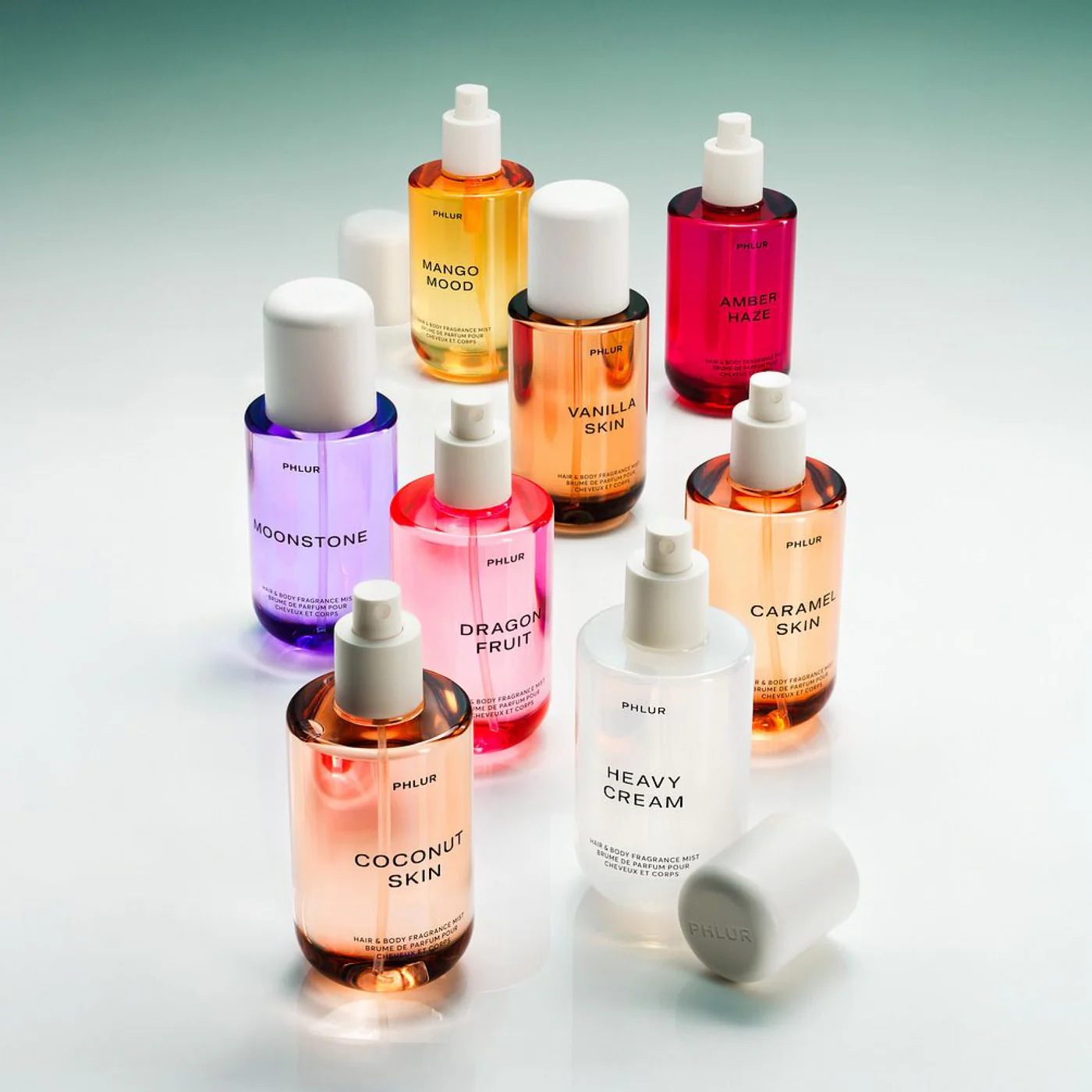 Phlur might be the clearest example of colour doing exactly what it's supposed to do: translating scent into visual information before a word is read. The Matcha Milk bottle is matte sage green. Berry Cream is soft pink. Vanilla Skin is warm beige. Heavy Cream is a cloudy, milky white. The colour-to-scent mapping is almost one-to-one, and that's the entire strategy.