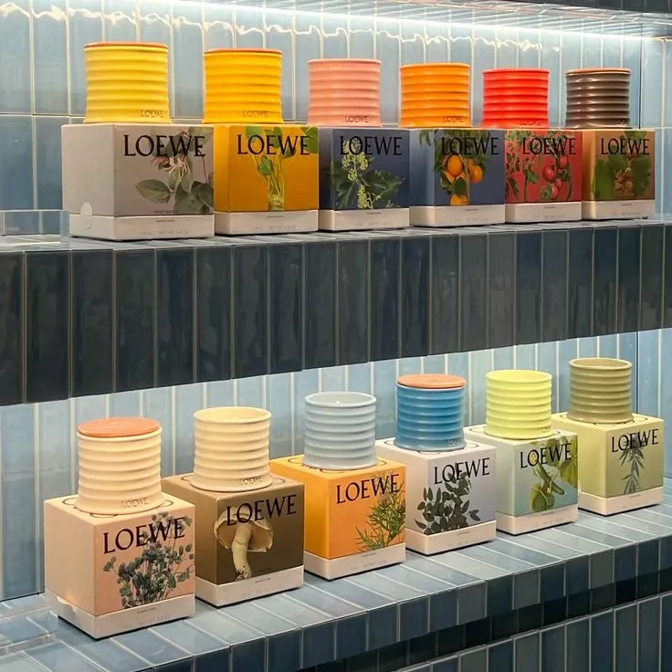 What Loewe understands is that colour strategy can flex across product categories without losing coherence, as long as the underlying logic is consistent. The fragrance bottles are refined and narrative. The candles are expressive and joyful. Both are unmistakably Loewe, and both use colour to communicate something specific about what's inside. The brand also maintains lines in clear glass with consistent white labelling and colour-differentiated lids — a system that works across retail environments where shelf recognition matters. It's colour strategy applied at every tier of the product range, with a different intention at each.